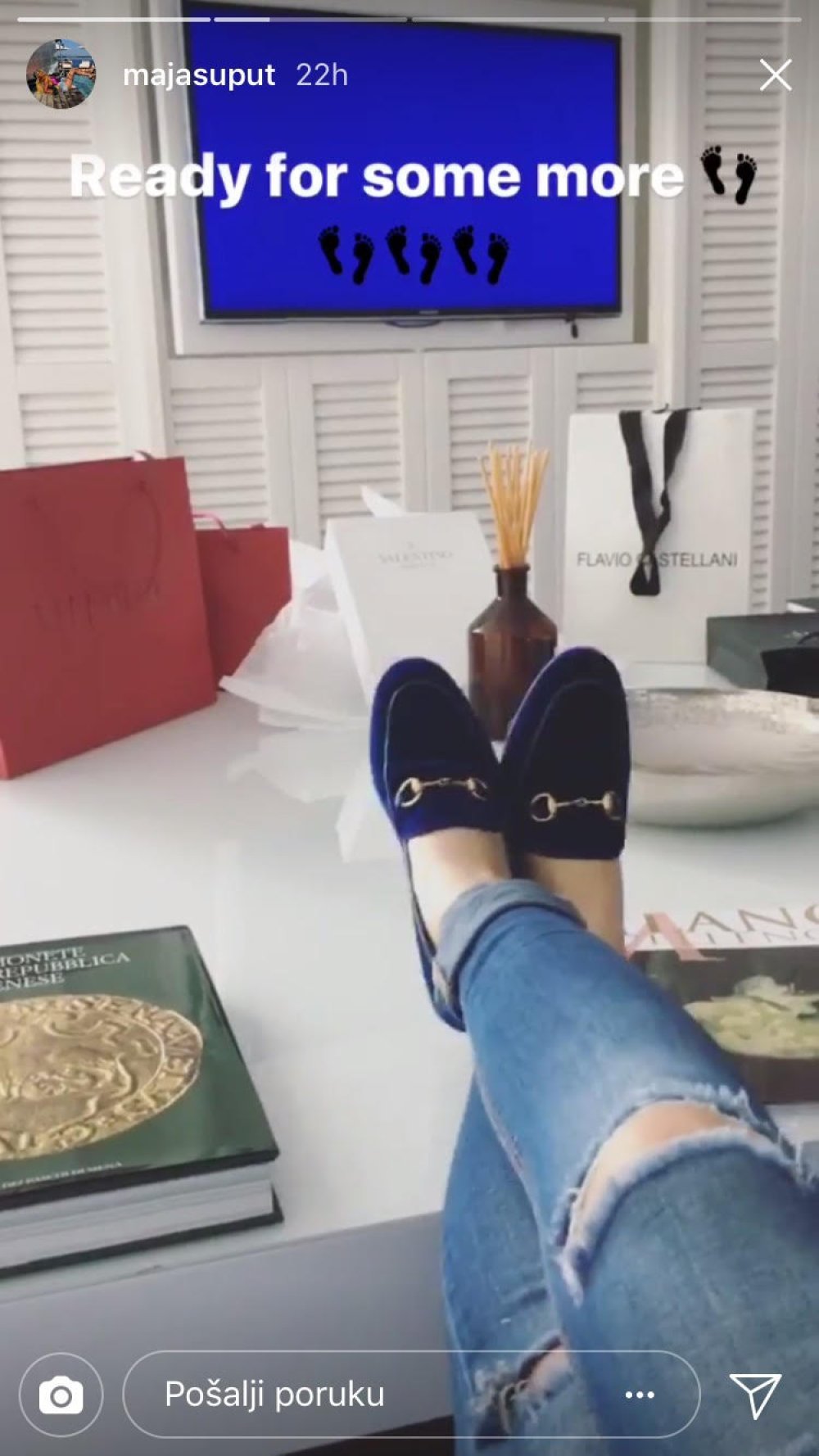 Pjevačica je za šetnju Milanom, koji slovi kao neokrunjena prijestolnica mode, izabrala klasične komade, traperice, tamnoplavi sako koji je sjajno sparila sa šeširom iste boje, dok je na noge umjesto štikli obula udobne Guccijeve mokasine od pliša.