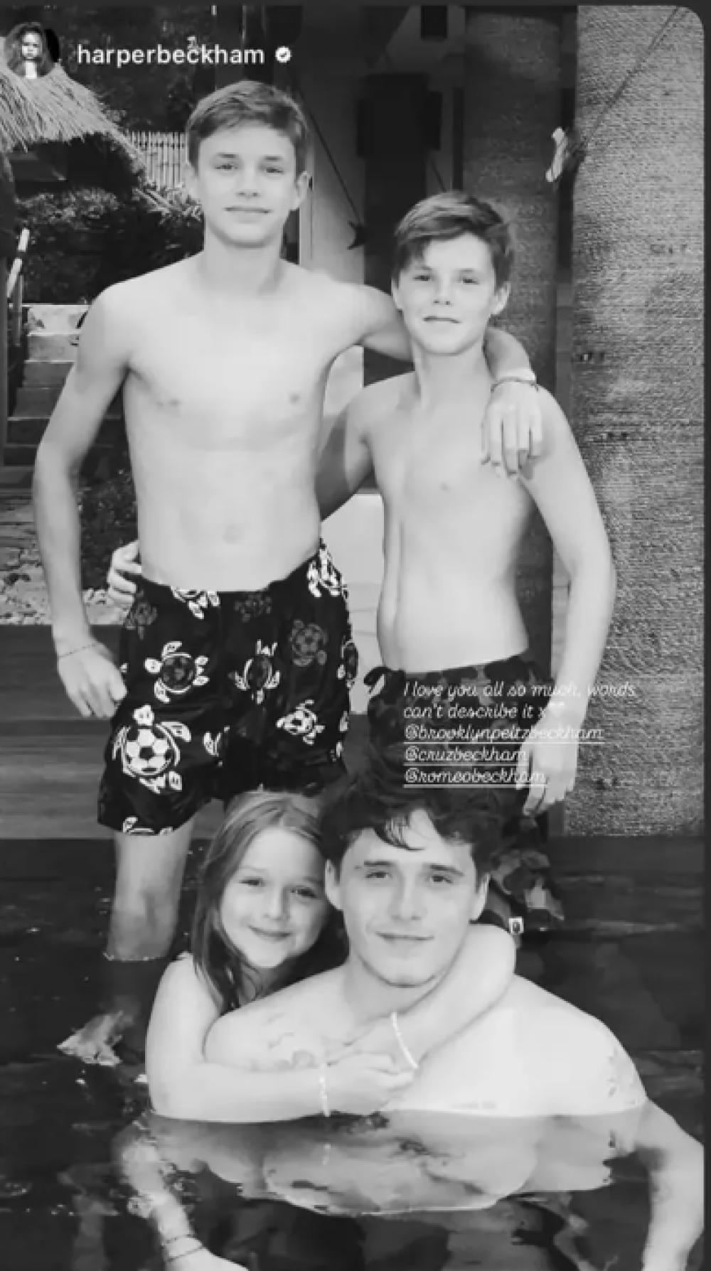 Četrnaestogodišnja Harper Beckham obilježila je Valentinovo emotivnom objavom posvećenom svojoj braći – Brooklynu, Romeu i Cruzu. Na privatnom Instagram profilu podijelila je crno-bijelu fotografiju iz djetinjstva na kojoj nasmijana grli najstarijeg brata Brooklyna, dok Romeo i Cruz stoje iza njih zagrljeni u bazenu.