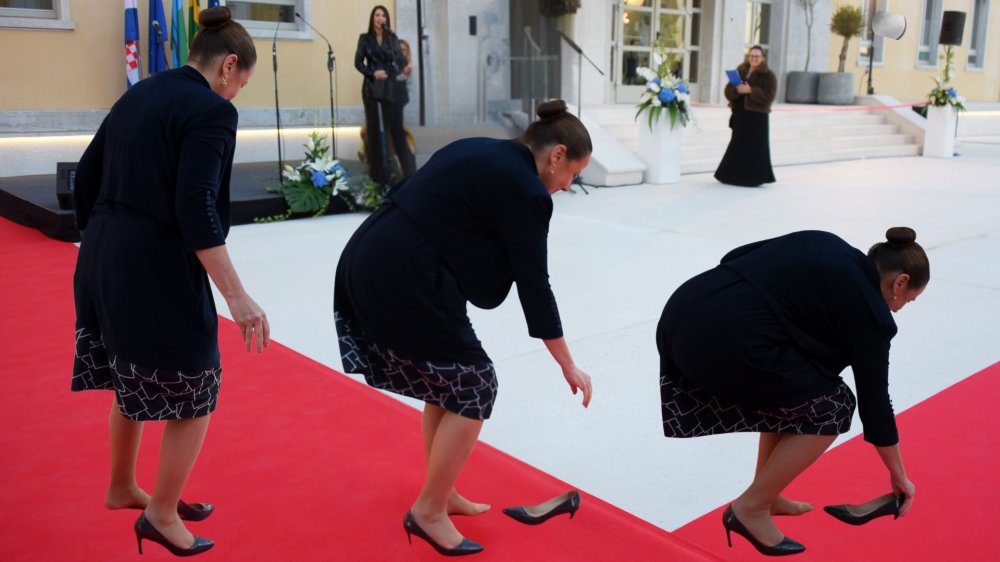 Sudeći po fotografijama, ministrica se nije dugo razmišljala što napraviti - skinula je cipelu, sagnula se do nje, a potom je primila i radila nešto po njoj dok nije bila sigurna da je 'riješila problem'.
