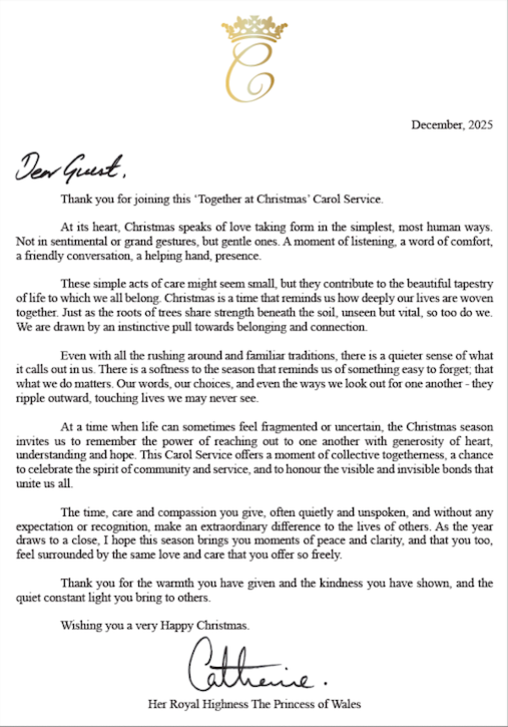 Kate je napisala posebno pismo koje će biti uručeno uzvanicima na njezinom sada već tradicionalnom godišnjem božićnom koncertu 'Together at Christmas', koji će se održati u Westminsterskoj opatiji u petak, 5. prosinca, kao i na 15 sličnih događanja u lokalnim zajednicama diljem Ujedinjenog Kraljevstva.