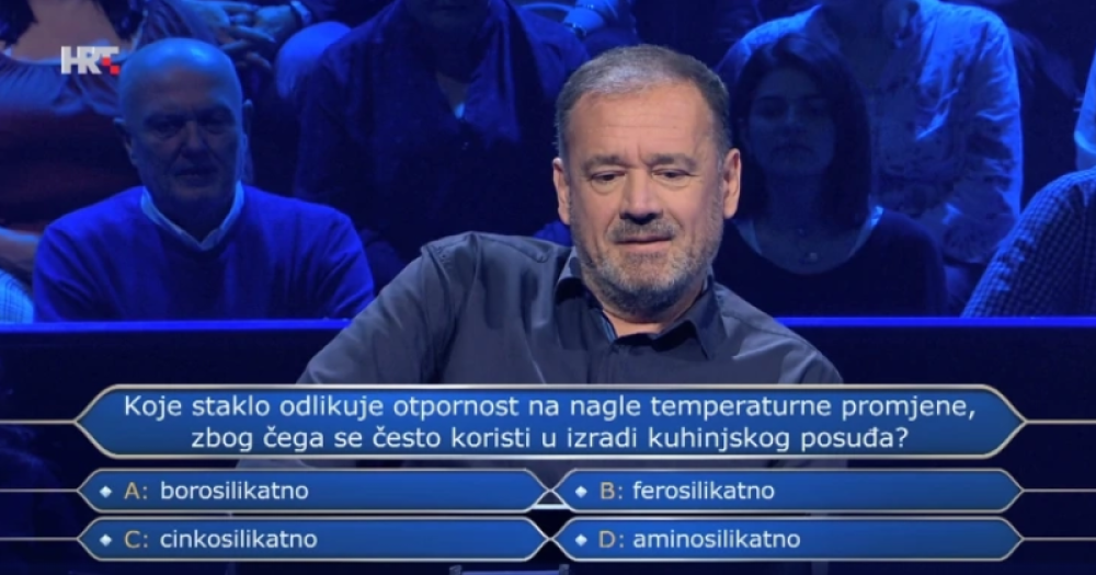 Međutim, pitanje za 34.000 eura pokazalo se previše zahtjevnim. Natjecatelju je postavljeno pitanje koje staklo odlikuje otpornost na nagle temperaturne promjene zbog čega se često koristi u izradi kuhinjskog posuđa. Ponuđeni odgovori bili su: A - borosilikatno, B - ferosilikatno, C - cinkosilikatno i D - aminosilikatno.