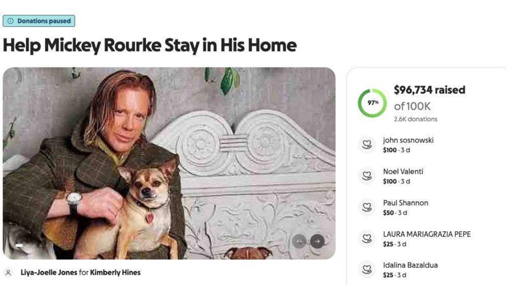 Najnoviji problemi izbili su nakon što mu je prošlog mjeseca uručen nalog da mora platiti 59.100 dolara zaostalih najamnina u roku od tri dana ili napustiti kuću koju je unajmio. GoFundMe kampanju pokrenula je suradnica njegova menadžerskog tima, uz tvrdnju da je sve učinjeno uz glumčevo dopuštenje, a cilj je u kratkom roku i premašen. Ipak, Rourke je u Instagram videu negirao da zna za akciju, naglasivši da nikada ne bi prihvatio 'milostinju' pa je pozvao fanove da zatraže povrat novca.
