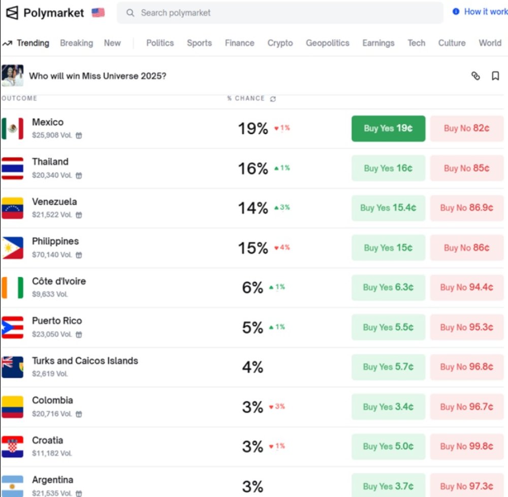 Prema platformi Polymarket, najveće šanse za pobjedu na ovogodišnjem izboru za Miss Universe imaju predstavnice Meksika, Tajlanda i Venecuele. Ove tri zemlje najčešće se ističu kao favoritkinje i po broju pozitivnih komentara na društvenim mrežama, a njihova popularnost dodatno je potvrđena i ukladno predviđanjima analitičara i navijača širom svijeta.