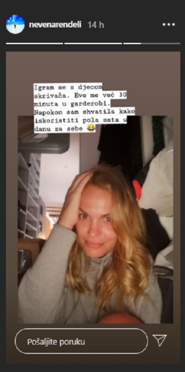 Na Instagram storyju je pak objavila simpatičnu fotografiju iz svog walk in ormara. 'Igram se s djecom skrivača. Evo me već 30 minuta u garderobi. Napokon sam shvatila kako iskoristiti pola sata u danu za sebe', duhovito je komentirala Nevena.