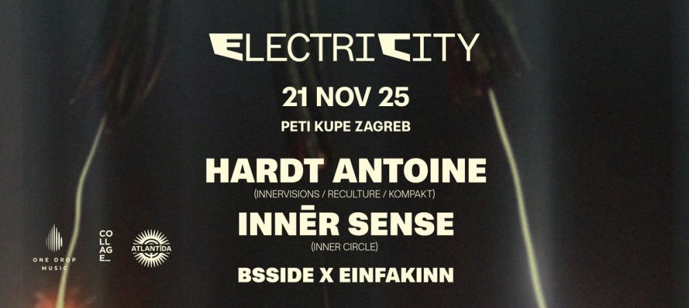 Spoj domaćih kolektiva ElectriCity, kojeg čine Atlantida, One Drop Music i Collage Events, ovog petka, 21. studenog, ulazi u novu zagrebačku klupsku sezonu. Novo izdanje uključuje dva premijerna nastupa u Zagrebu te u Peti Kupe dolaze Hardt Antoine, britanski producent koji se prošle godine proslavio nastupom na Bruning Manu te Innēr Sense, beogradski duo poznat po melodičnom zvuku i izdanjima za priznate svjetske etikete. Za pultom će im se pridružiti rezidenti Bsside i Einfakinn, a vrata kluba bit će otvorena od 23:00 sata.