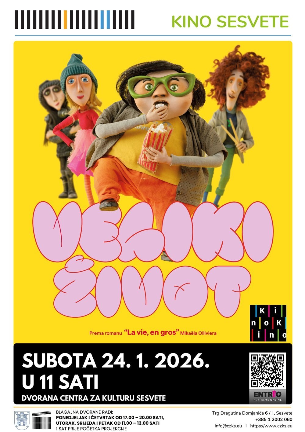 U subotu, 24. 1. u 11 sati, projekcijom animiranog filma Veliki život (10+) Centar za kulturu Sesvete pridružuje se programu KinoKino, najpoznatijem cjelogodišnjem filmskom programu za djecu u organizaciji Zagreb Film Festivala. Program je nastao s ciljem da popularizira svjetsku kinematografiju za djecu te da uz brojne edukativne sadržaje omogući poseban doživljaj odlaska u kino i utječe na stvaranje novih generacija kinopublike.