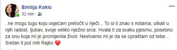 'Ne mogu tugu koju osjećam pretočit u riječi... To si ti znao s notama, utkati u njih radost, ljubav, svoje veliko nježno srce. Hvala ti za svaku pjesmu, posebno za onu koja mi je promijenila život. Nestvarno mi je da se opraštam od tebe... Sretan ti put mili Rajko', shrvana je Emilija Kokić.