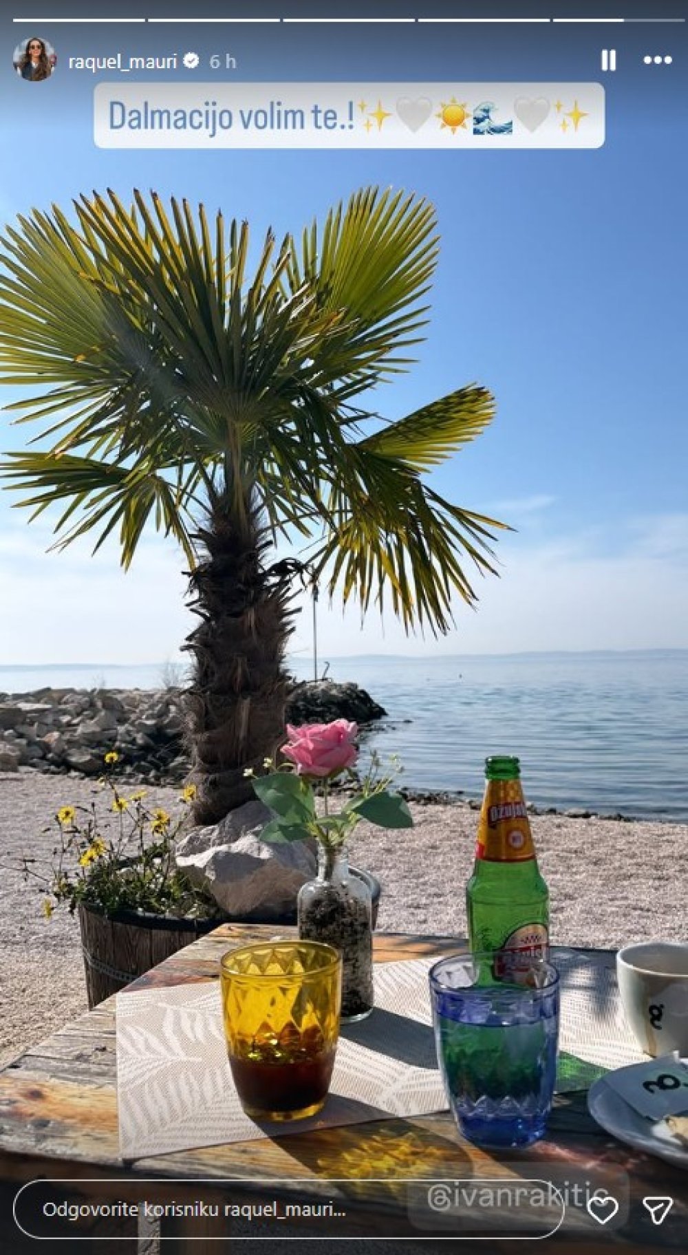 Na Instagramu je objavila fotografiju iz kafića smještenog uz samu plažu. U opuštenoj atmosferi uživaju u suncu, pogledu na more i palmama koje okružuju popularno ljetno odredište. Uz fotografiju je kratko poručila: ‘Dalmacijo, volim te!’