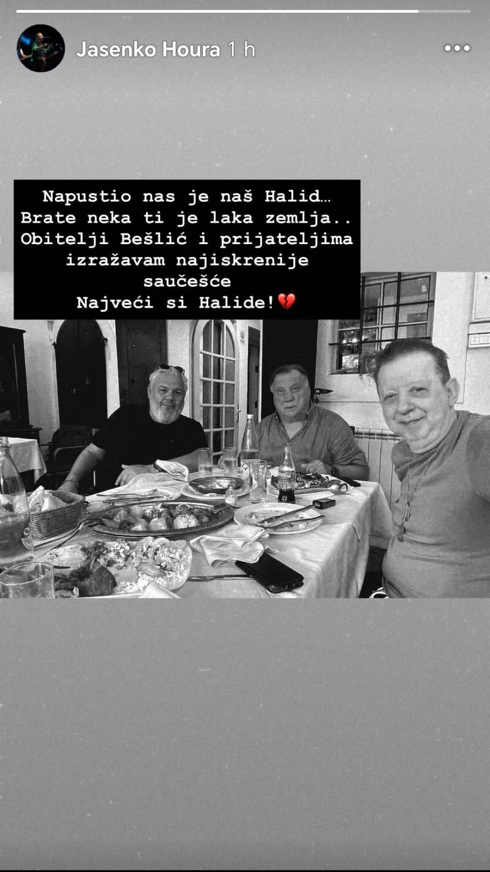 I Jasenko Houra se oprostio se emotivnom porukom na Instagramu. 'Brate neka ti je laka zemlja. Obitelji Bešlić i prijateljima izražavan najiskrenije saučešće. Najveći si Halide', poručio je glazbenik.