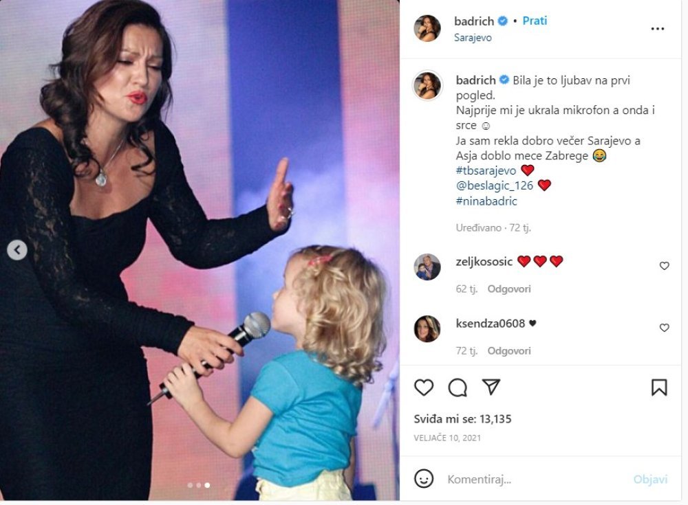 U jednom od postova Nina je svojedobno napisala: 'Bila je to ljubav na prvi pogled. Najprije mi je ukrala mikrofon, a onda i srce. Ja sam rekla - dobra večer Sarajevo, a Asja - doblo mece Zabrege.' U komentarima ispod te objave odmah se oglasio i raznježeni Enis. Kasnije je Nina objavila snimku tog događaja za pamćenje te uz emotikon srca napisala: 'Asja'.