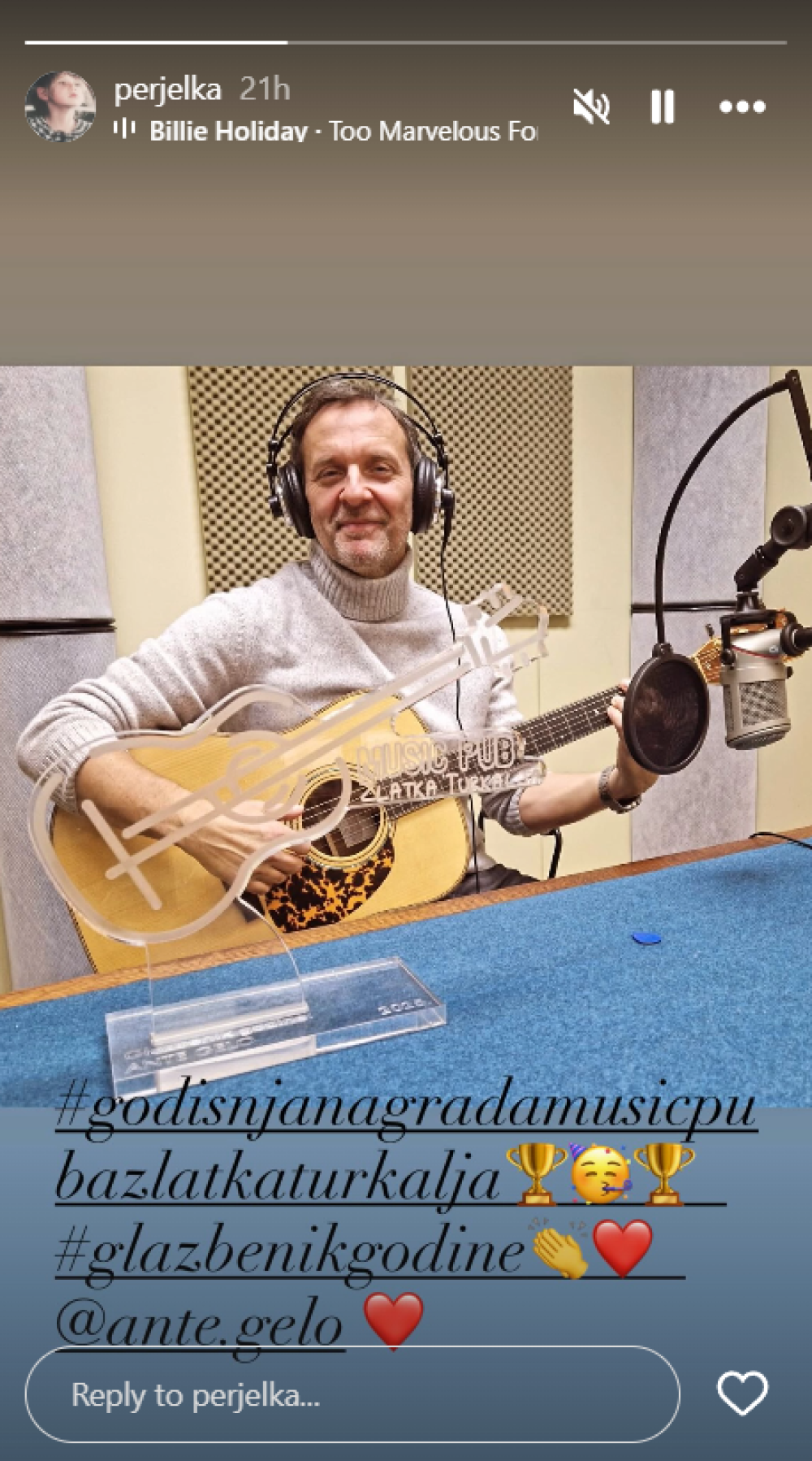 On je sada sa svima podijelio da je dobio godišnju nagradu Hrvatskog radija koju mu je uručio autor i urednik emisije, Zlatko Turkalj. Koliko je sretna zbog još jednog uspjeha svog partnera, pokazala je podijelivši tu informaciju uz emotikone srca i zlatnih pehara.