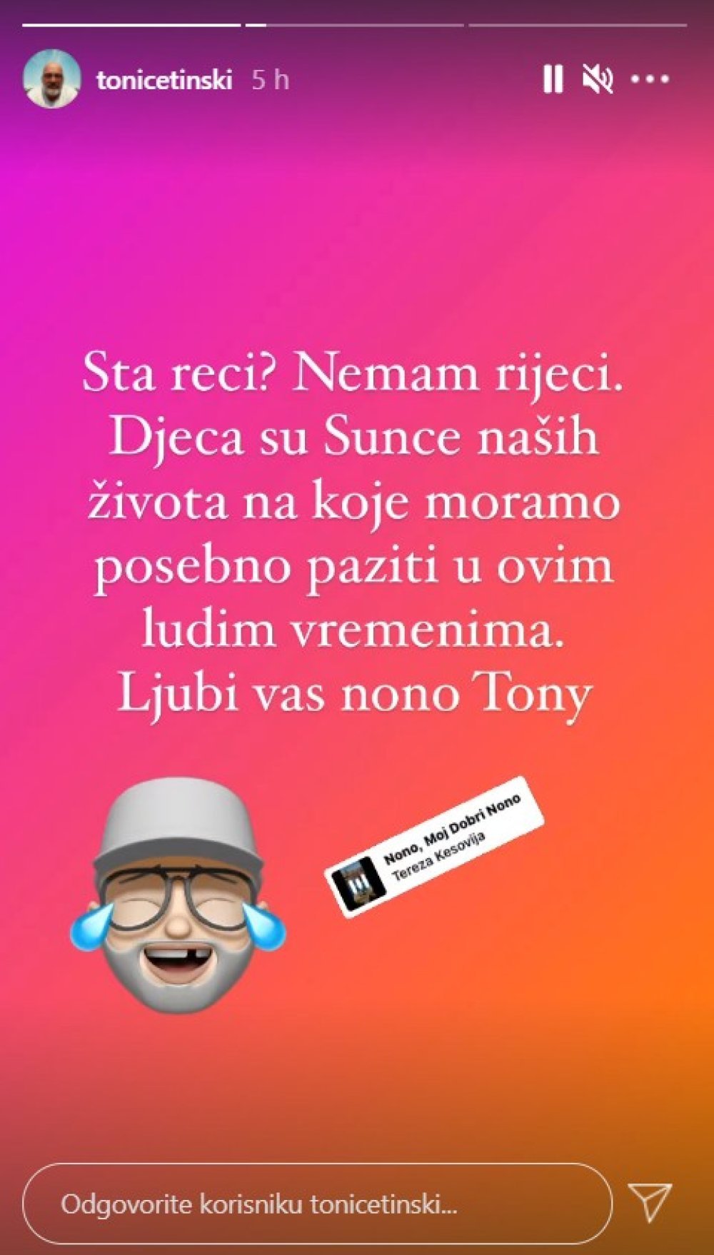 Emotivan i vrlo uzbuđen Tony u slijedećem Storyju je napisao: 'Što reći? Nemam riječi. Djeca su Sunce naših života na koje moramo posebno paziti u ovim ludim vremenima. Ljubi vas nono Tony.' Nakon lijepe vijesti Tony je i nazdravio te to pokazao u trećem Storyju.