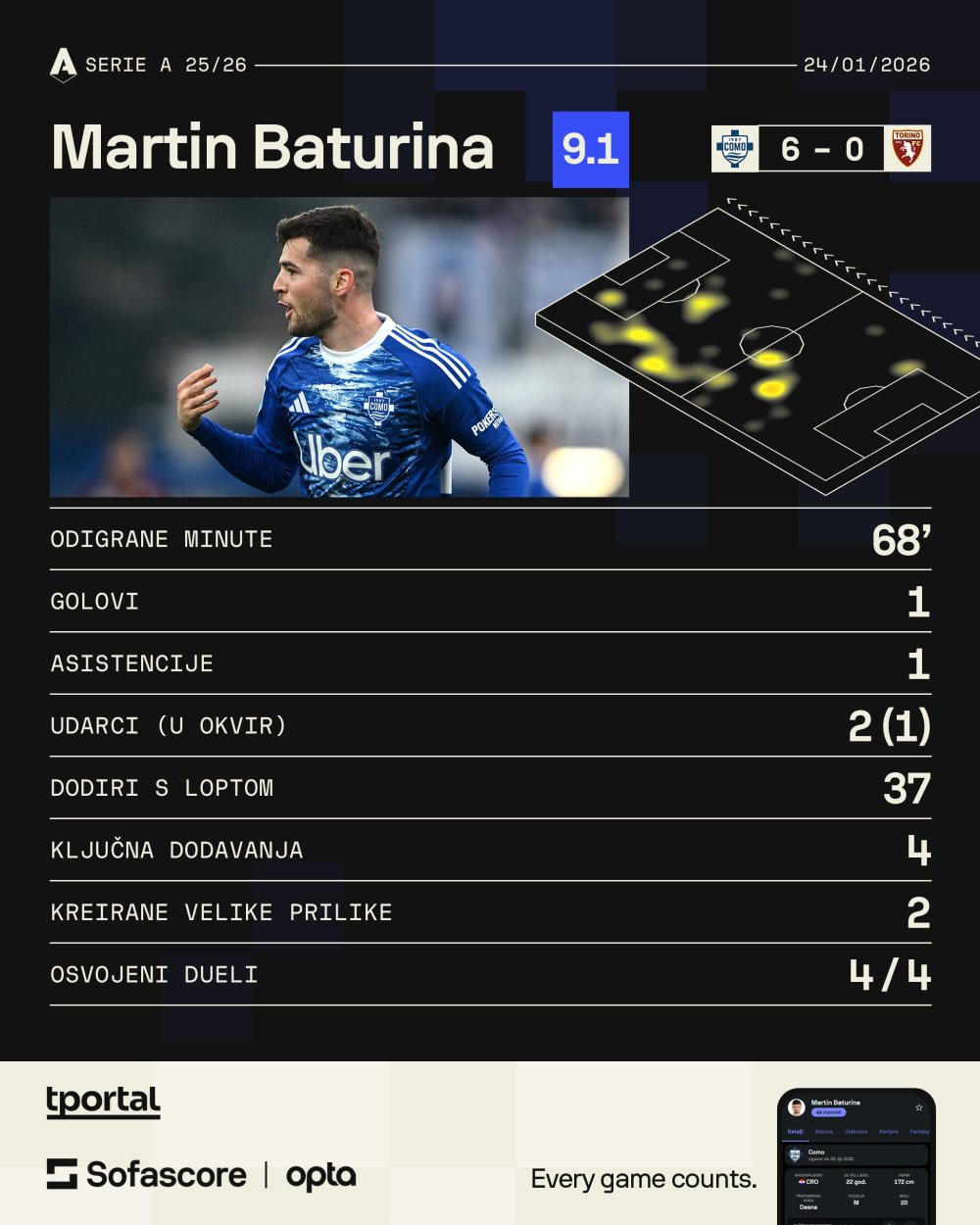 Baturina je tako skupio gol i asistenciju, dvije kreirane velike prilike, četiri ključna dodavanja i četiri osvojena duela sa stopostotnom uspješnošću. To je bila njegova uvjerljivo najbolja utakmica od dolaska u Lombardiju i nastavak sjajne forme koju je pokazao u posljednje vrijeme.