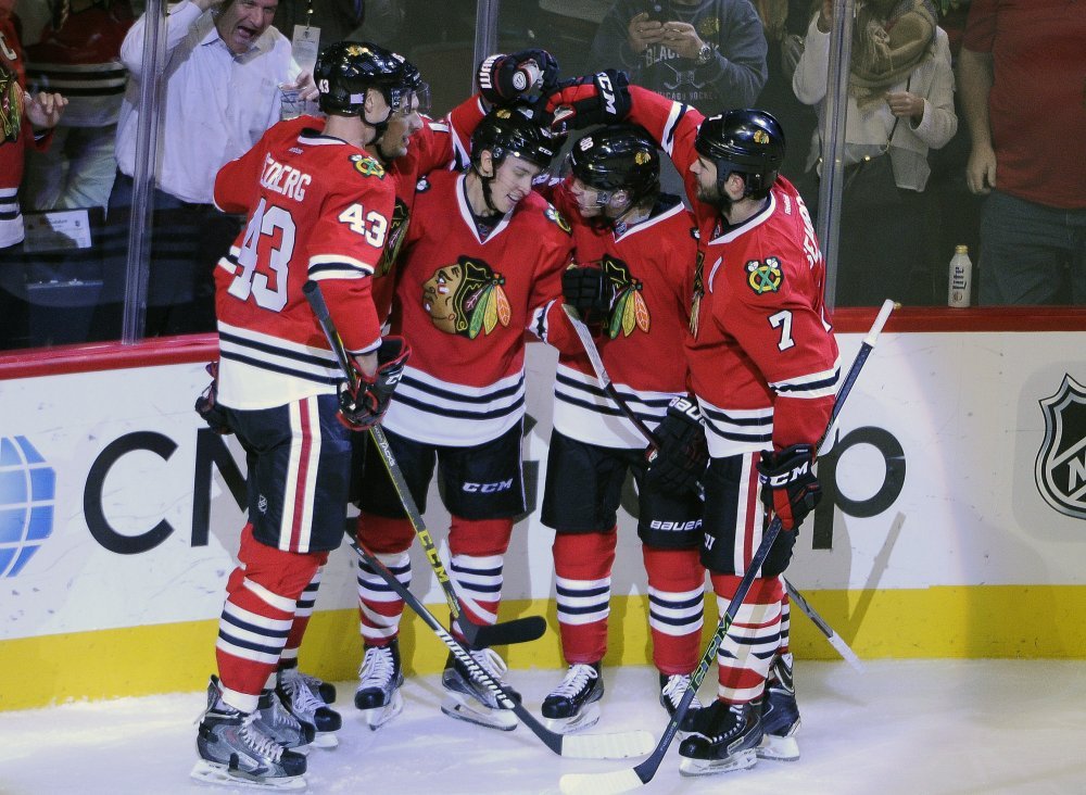 Gubeći 2:1 na početku zadnje trećine, Chicago (7-5-0) je zabio tri gola iz 12 udaraca orema vrataru Kingsa Jonathanu Quicku, dok je njegov golman Corey Crawford obranio 19 udaraca prema svojim vratima u tom zadnjem dijelu utakmice. Na cijeloj utakmici Crawford je imao 33 obrane. Strijelci u zadnjoj trećini za Blackhawkse bili su Patrick Kane, Teuvo Teravainen i Artem Anisimov. Kapetan Blackhawksa Jonathan Toews zabio je prvi gol za Chicago. Golove za Los Angeles, oba u prvoj trećini, zabili su Alec Martinez i centar Anže Kopitar.