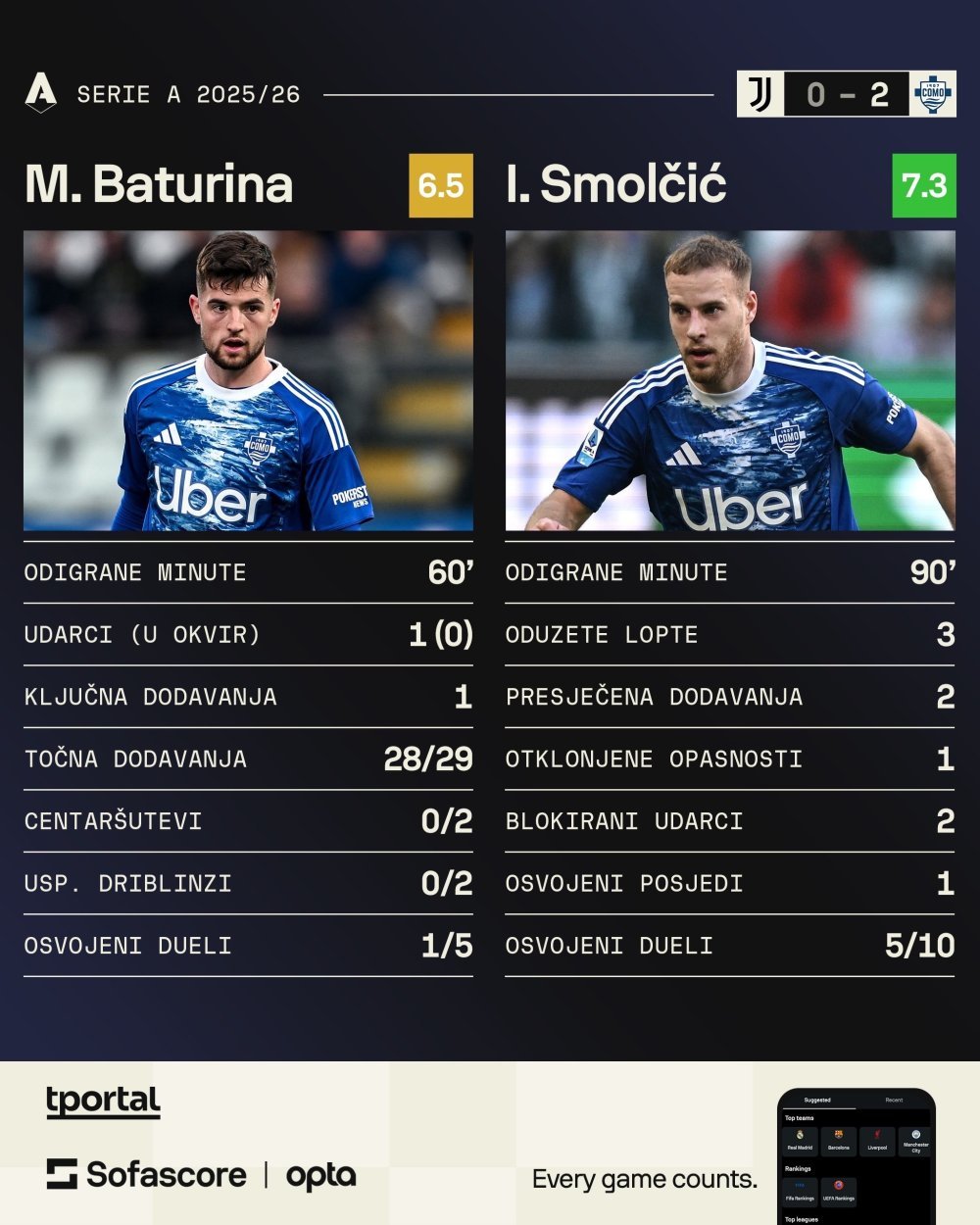 Juventus i Como odigrali su susret 26. kola talijanske Serie A, a gosti su u Torinu odigrali zrelu i discipliniranu utakmicu te slavili s uvjerljivih 0:2.