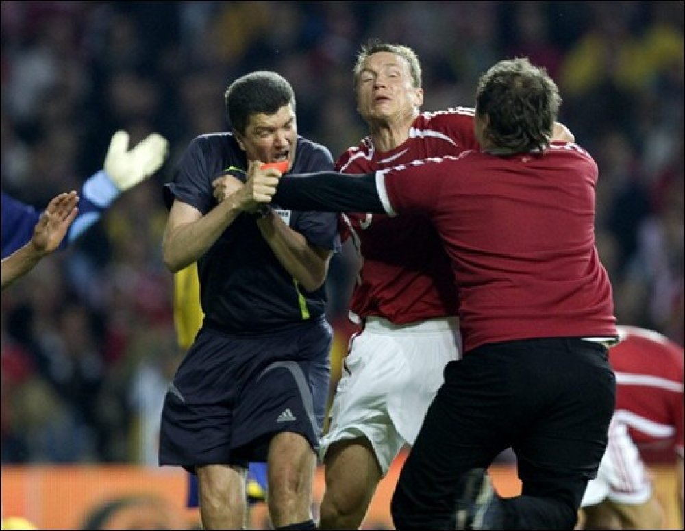 Navijač, čije se ime po sudskoj odluci ne smije objaviti, uletio je na teren nekoliko minuta prije kraja susreta pri rezultatu 3:3. Utakmica je prekinuta, a UEFA je susret registrirala rezultatom 3:0 za Šveđane. DBU je kažnjen sa 100.000 švicarskih franaka i zabranom nastupanja dvije utakmice danske reprezentacije na domaćem stadionu.