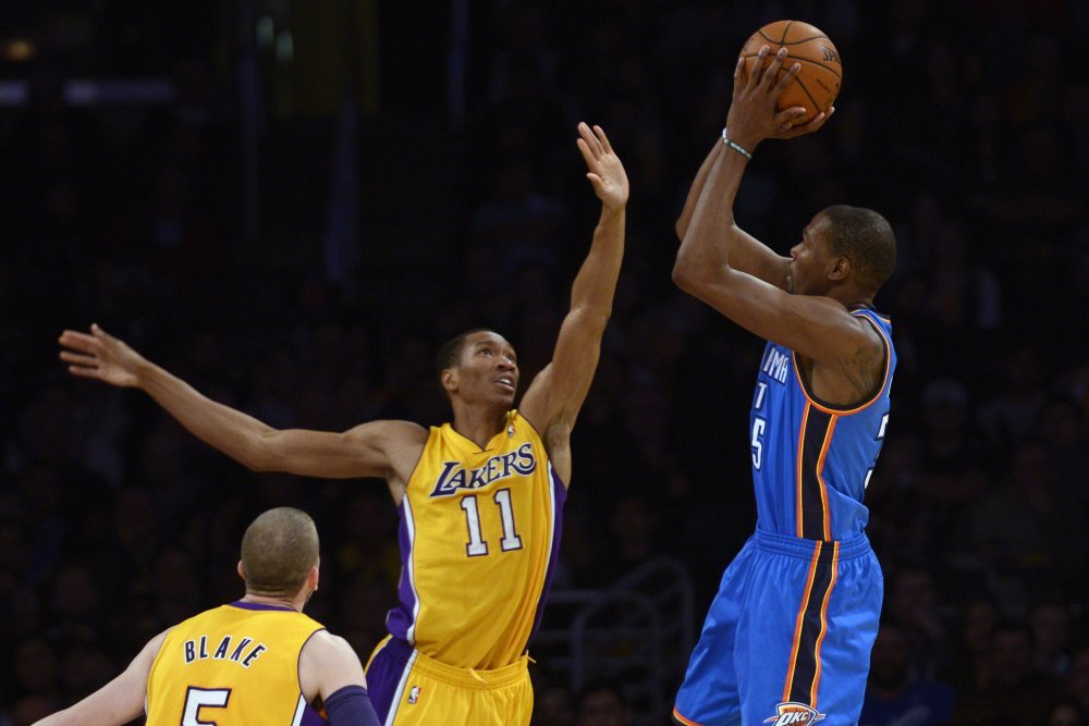 Košarkaši Oklahoma City Thundera slavili su na gostovanju kod Los Angeles Lakersa u Staples Centeru 107:103 prvenstveno zahvaljujući sjajnom učinku Kevina Duranta...