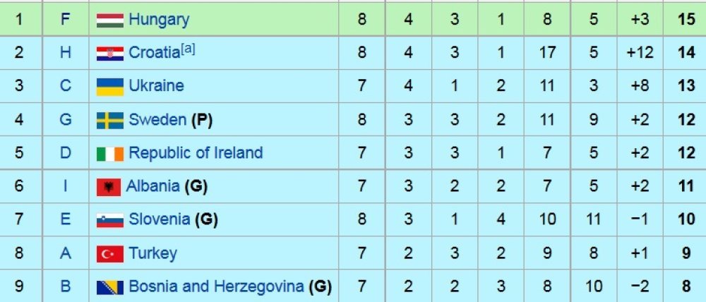 Još problematičnija situacija je u skupini F, gdje Mađari imaju bod više od naših na ljestvici trećih ekipa, a obje reprezentacije su odigrale sve susrete koji ulaze u računicu, jer oni protiv zadnjih, Malte i Grčke, neće se računati. Zato Rumunji moraju kiksati kod Farskih Otoka u posljednjem kolu, a Mađarska biti bolja od Grčke da bi došlo do smjene na trećem mjestu, a naši profitirali i otišli izravno na Euro.