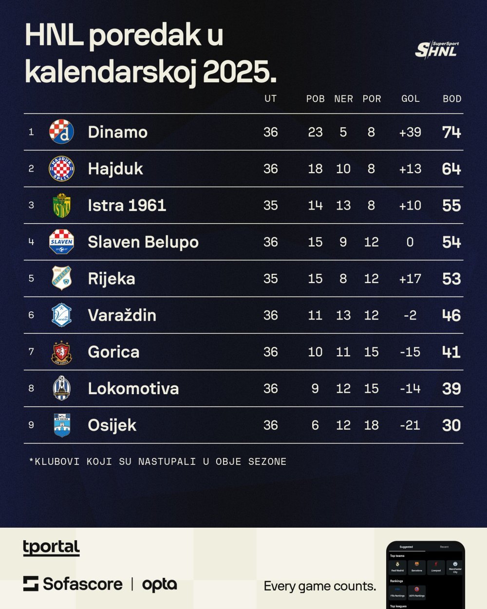 Kraj godine je savršen trenutak za pregled poretka SuperSport HNL-a gledano isključivo kroz rezultate ostvarene tijekom ove godine. Prema ukupnom broju osvojenih bodova, najuspješniji je Dinamo. Aktualni viceprvak u 36 prvenstvenih susreta skupio je 74 boda i jasno se odvojio od konkurencije.