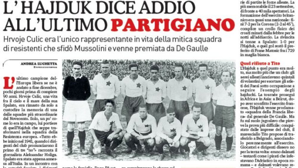 Povodom nedavne smrti Hrvoja Čulića, posljednjeg iz Hajdukove momčadi u Drugom svjetskom ratu, list La Gazzetta dello sport objavio je veliku priču o najslavnijim danima splitskog kluba