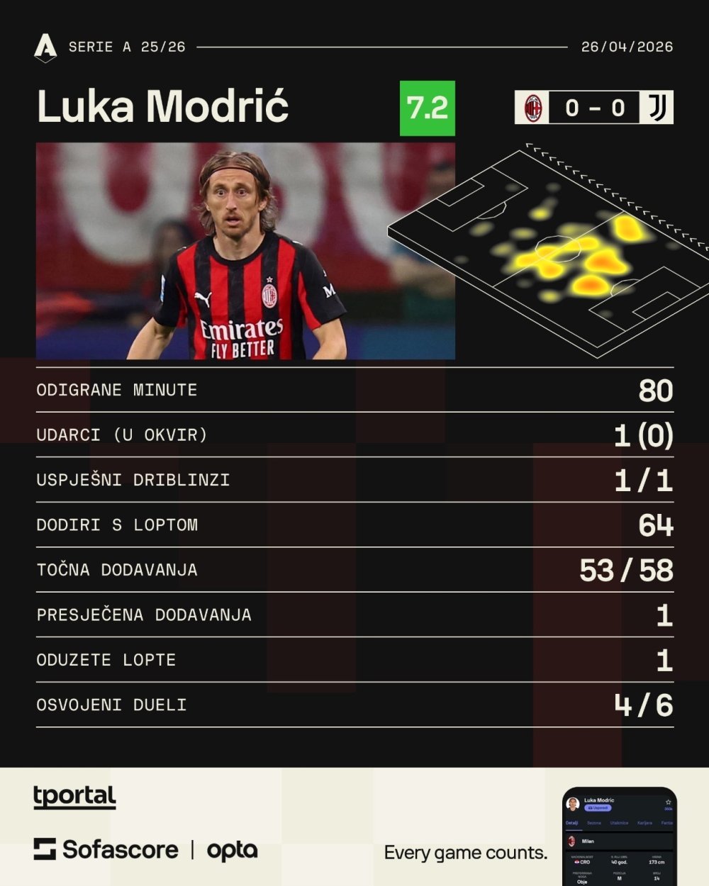 U utakmici koja je rezultatski ostala prazna, Modrić je ponovno pokazao zašto u Milanu ima posebnu težinu. Nije bilo velike asistencije ni poteza koji će završiti u sažecima, ali bilo je onoga zbog čega ga treneri najviše cijene - mira, ritma, odluke i kontrole u utakmici u kojoj je svaka pogreška mogla skupo stajati.