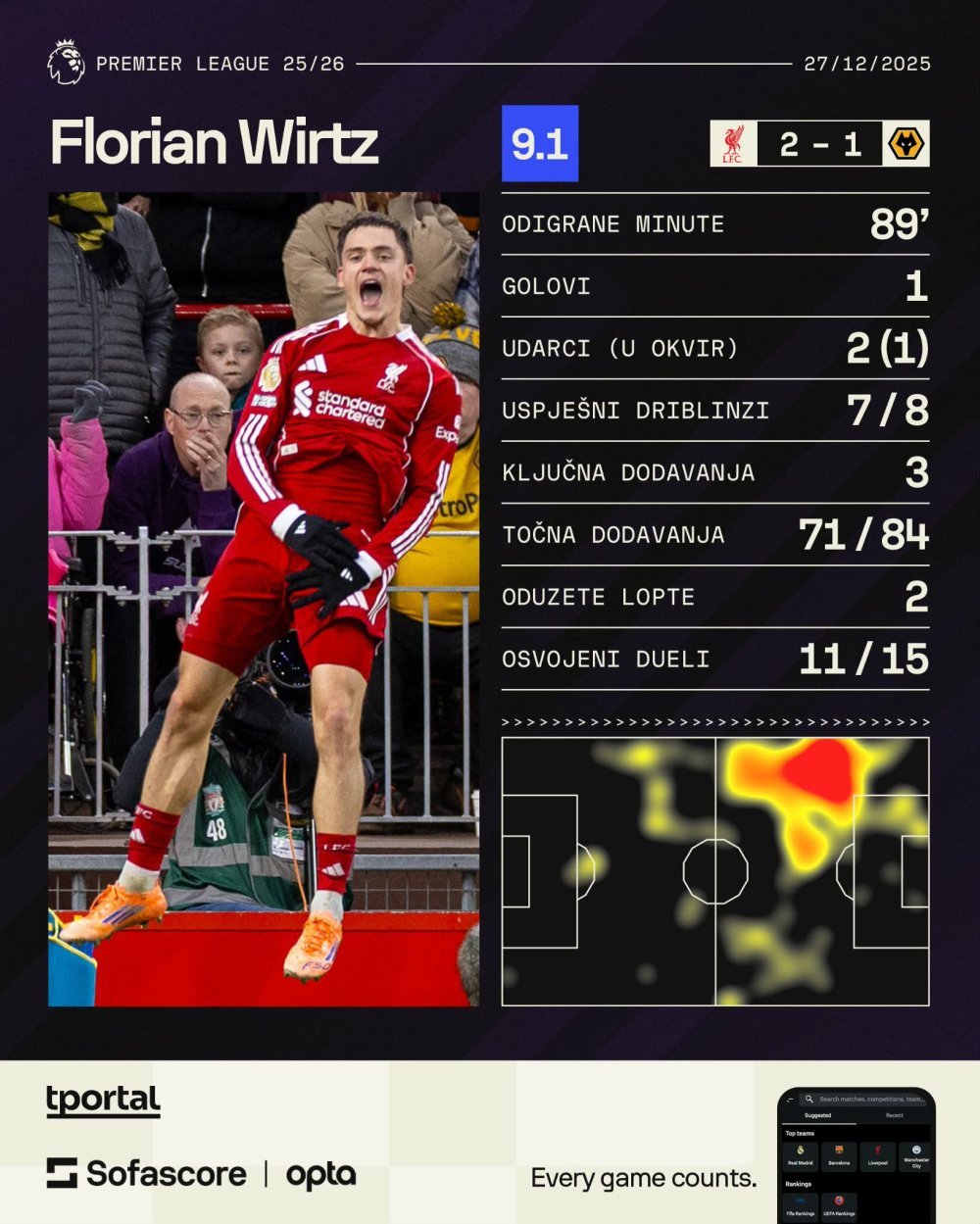 Osim toga, Wirtz je odigrao na zaista zavidnoj razini. Potpuno zasluženo odnio je titulu igrača utakmice, što ne treba čuditi s obzirom na asistenciju, sedam uspjelih driblinga, tri ključna dodavanja i 11 od 13 osvojenih duela.