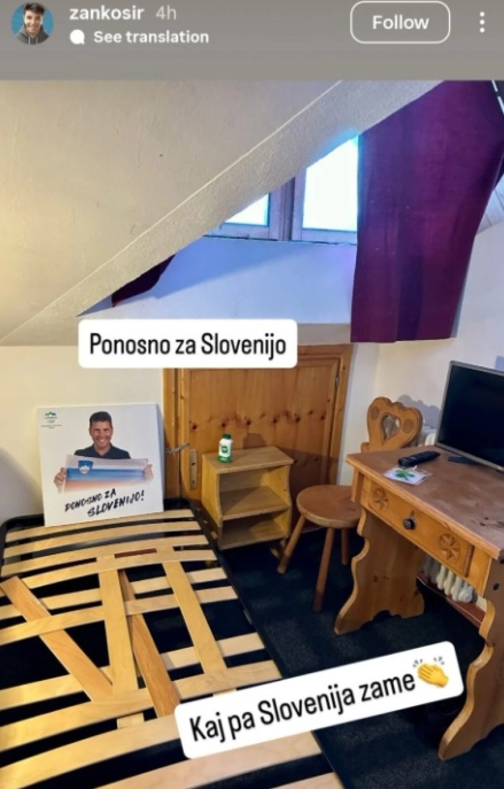 Iskoristio je slogan slovenske reprezentacije pa je napisao 'Ponosno za Sloveniju'. Nakon toga je objavio i fotografiju šatora u snijegu uz opis da će mu tako izgledati soba na sljedećim Igrama.
