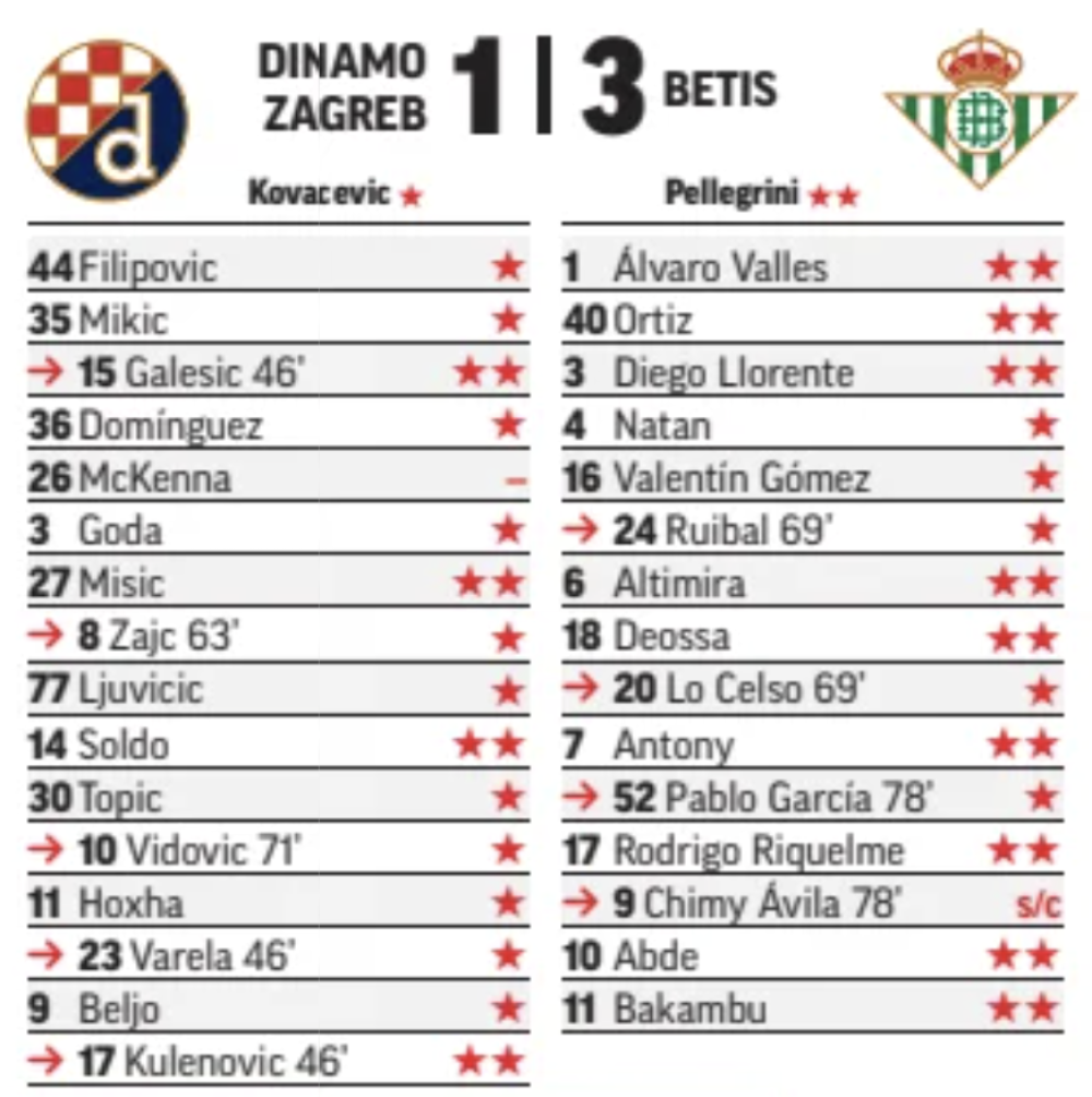 Betis je slavio 3:1 autogolom Domingueza te golovima Riquelmea i Antonyja od 31. do 38. minute prije nego što je Niko Galešić u 89. ublažio Dinamov poraz.