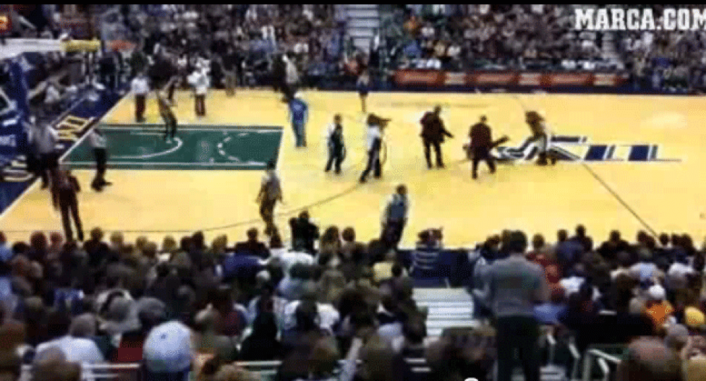 S leđa mu je prišla maskota domaće momčadi medvjed. Ona je nosila tablu na kojoj je pisalo 'Ja sam gubitnik' (I'm a loser). Provokator je to primijetio i odgurnuo maskotu. Došlo je do naguravanja, a osiguranje je preko parketa krenulo izvesti gostujućeg navijača.