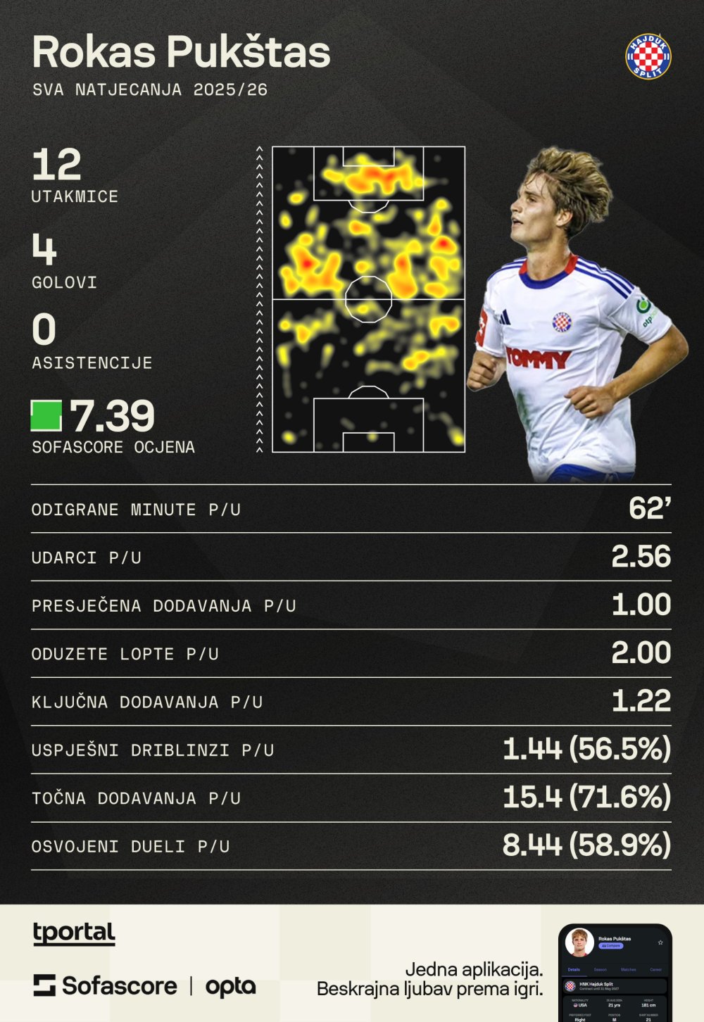 Podaci iz tekuće sezone itekako potvrđuju gore navedeno. Primjerice, niti jedan igrač u HNL-u trenutačno nema više osvojenih duela po utakmici. Pukštas ih ima čak 8,44 s postotkom uspješnosti od 58,9 posto, a to je izvanserijski učinak. Prilična je rijetkost da će igrač s tolikim volumenom duela imati toliko visok postotak uspješnosti, no Pukštasu to za sada uspijeva. Dakako, tu posebno treba naglasiti zračne duele u kojima je najbolji na svojoj poziciji. Sjajna skok-igra i tajming za napadanje prostora glavni su razlozi zbog kojih je veznjak toliko opasan u zraku.