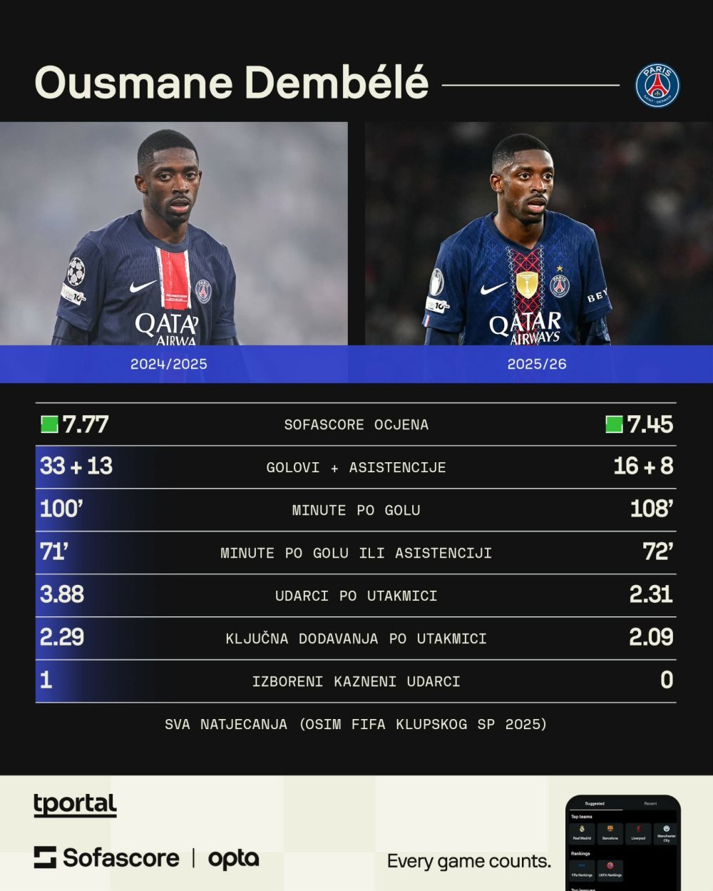 Iako su ga i ove sezone usporile ozljede pa će teško brojkama ponoviti godinu koja mu je donijela Zlatnu loptu, Dembélé trenutačno djeluje zrelije i kompletnije nego ikad. Njegov gol protiv Liverpoola savršen je dokaz. Francuz se spušta u vezni red i u potpunosti razbija strukture pritiska. Njegovo razumijevanje igre ogleda se u sjajnom propuštanju lopte i nastavku trka, a njegova klasa u lažnjaku i hladnokrvnoj završnici. Cijelu karijeru Dembélé se mučio uskladiti ta dva aspekta, no konačno je ovladao svojim moćima.
