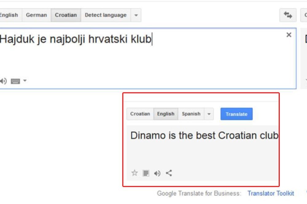 Kad se upiše 'Hajduk je hrvatski najbolji klub', Googleov prevoditelj će to prevesti 'Dinamo is the best Croatian club'. I to ne samo na engleskom jeziku nego i na drugima koji su u ponudi.