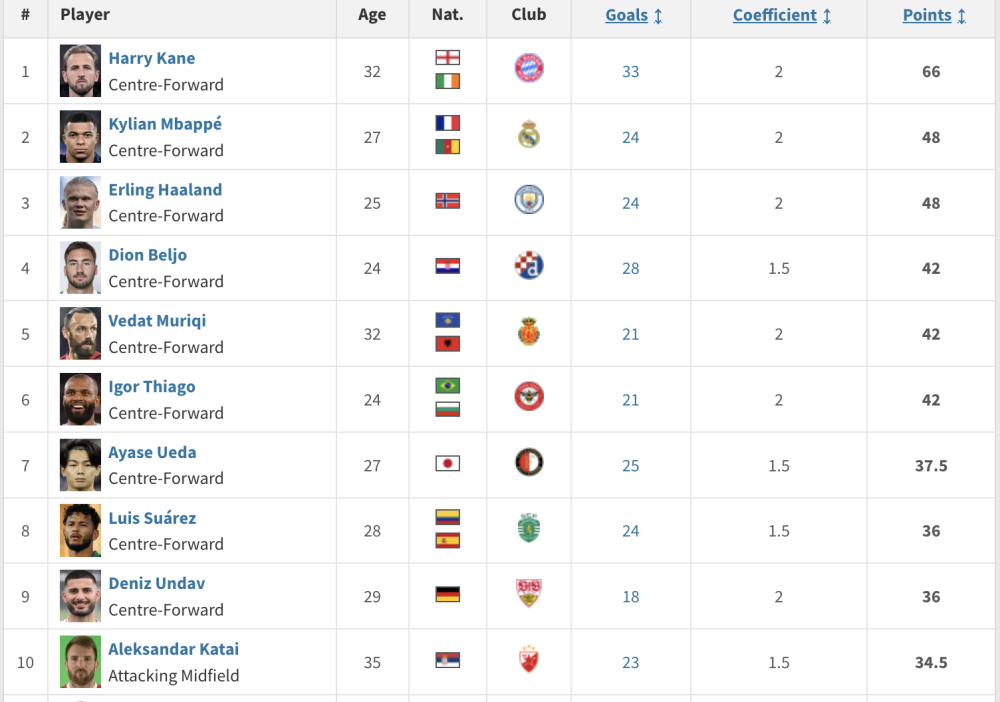 Bundesliga nosi koeficijent 2 pa tako Kane s 33 gola ima 66 bodova. Na drugome mjestu je Kylian Mbappe s 24 gola, koliko ima i Erling Haaland. Budući da Premier liga nosi koeficijent 2, njih dvojica imaju po 48 bodova, a iza njih je Beljo.