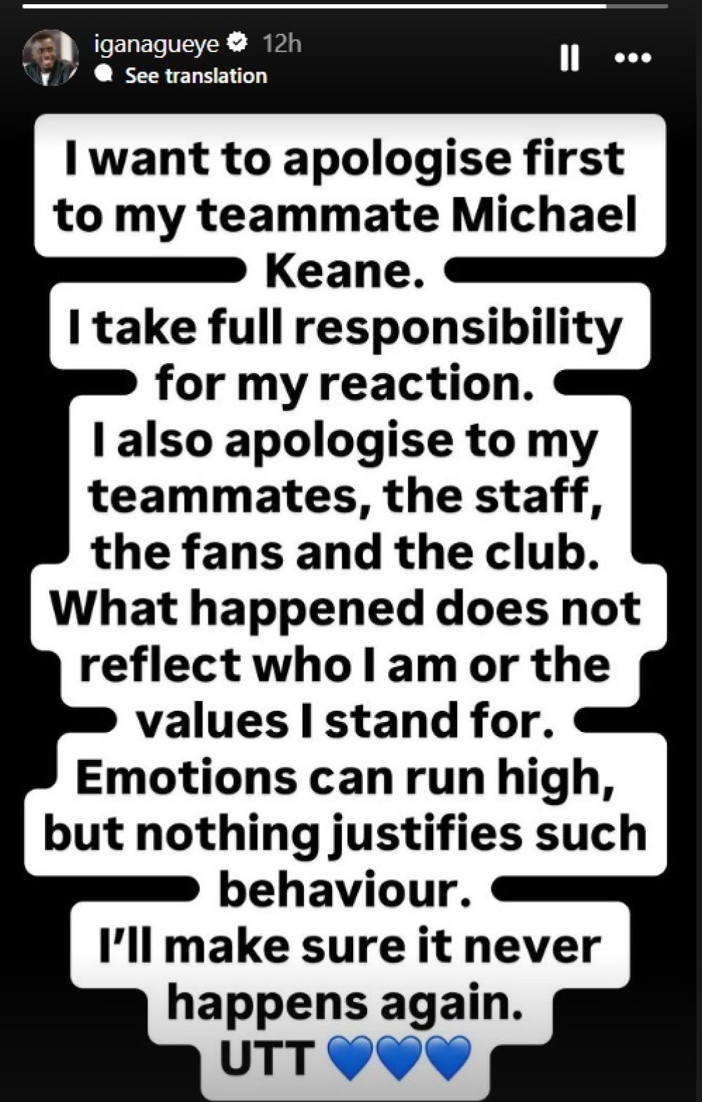 'Prvenstveno se želim ispričati Michaelu Keaneu. Preuzimam punu odgovornost za svoju reakciju. Također bih se želio ispričati suigračima, stručnom stožeru, navijačima i klubu. Ono što se dogodilo ne odražava ono tko sam niti vrijednosti za koje se zalažem. Emocije ponekad prevladaju, ali ništa ne opravdava ovakvo ponašanje. Budite sigurni da ću učiniti sve kako se ovo više ne bi ponovilo', stoji u Gueyevoj objavi.
