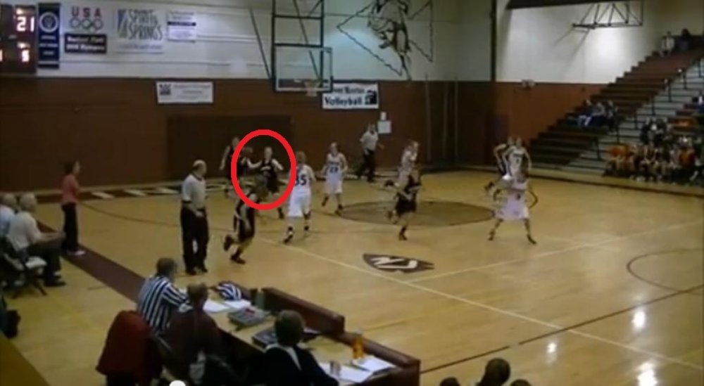 No ona je preko cijelog terena jednom rukom bacila loptu (nije poznato je li pucala ili pokušavala pronaći suigračicu) koja se odbila od parketa, skakutala po obruču, a zatim prošla kroz mrežicu.