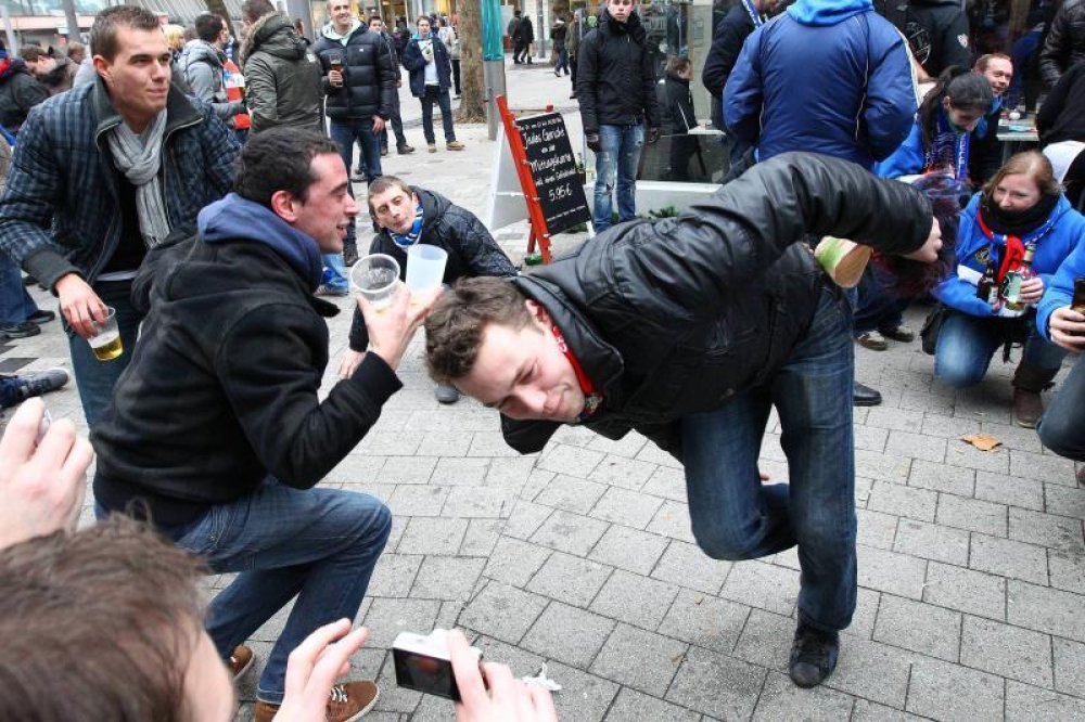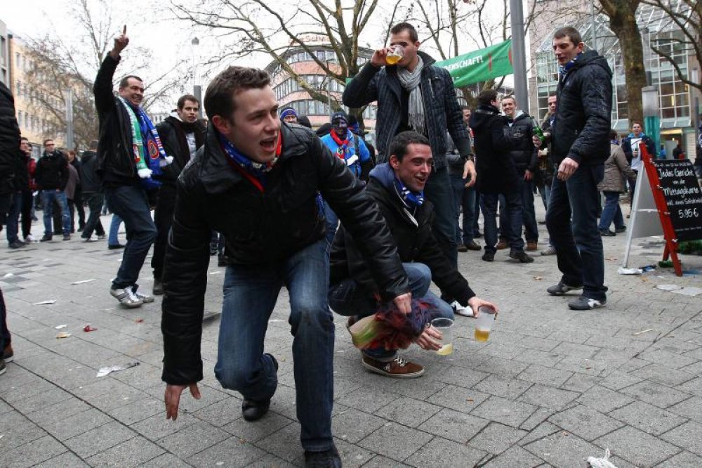 Njemačka policija na konjima osigurava središte grada i premda zasad nisu zabilježeni veći problemi, činjenica je da se, kako se bliži večer, gostujući navijači sve pijaniji i skloniji provokacijama. Prve baklje već su poletjele gradskim trgovima, no intervencije specijalaca nije bilo.