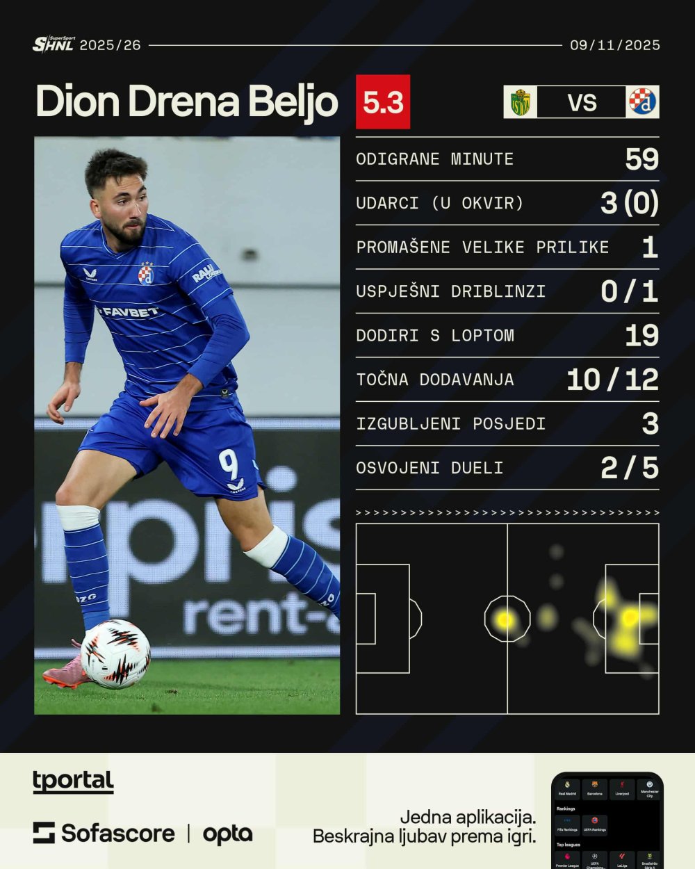 Beljo je tako imao tri udarca, isto toliko izgubljenih posjeda, dva osvojena duela, niti jedan uspjeli dribling i promašenu veliku priliku. Upravo je ta situacija prikupila najviše pažnje.