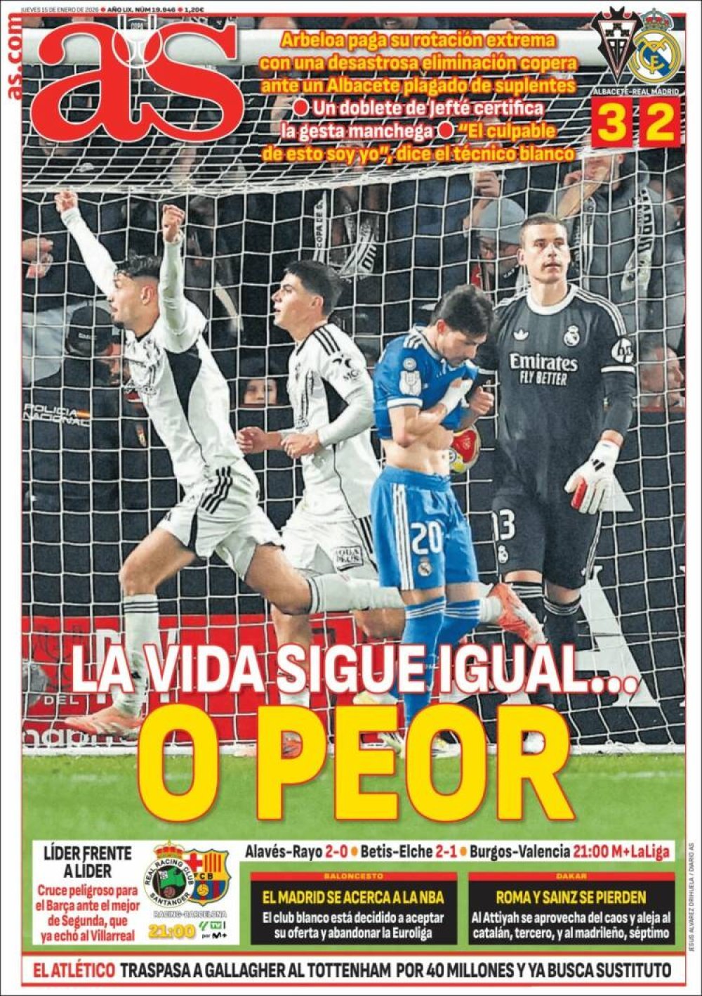 Tak je Marca izašla s crnom naslovnicom i jednostavnim naslovom 'Totalni debakl'. As je na naslovnici objavio fotografiju utučenih igrača Reala i naslov 'Sve je isto kao i prije...ili gore' dok je Sport objavio fotografiju na kojoj se Vinicius Junior svađa s Arbeloom i naslov 'Odvratno smiješno'.