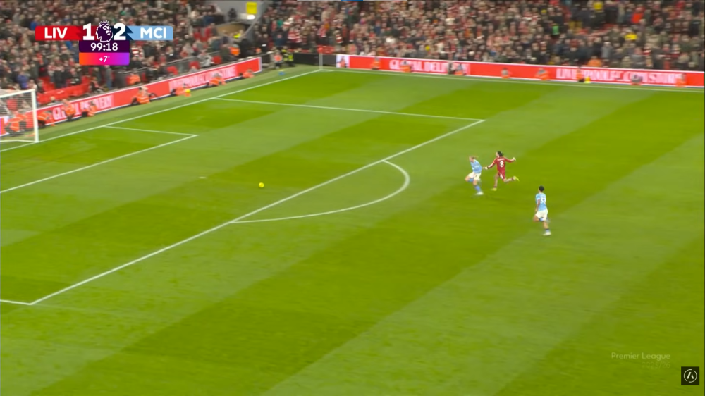 Nakon toga dogodila se prava drama. Liverpool je poslao Alissona u napad kako bi pomogao na korneru i tako ostavio prazna vrata. City se obranio i krenuo u kontranapad, a Rayan Cherki poslao je loptu s pola terena u gol. Lopta je išla jako sporo pa su se za nju trkali Szoboszlai i Haaland.