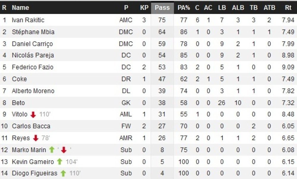 Sevilla je igrala bolje kako na početku jednog, tako i na početku drugog poluvremena, da bi u posljednjih dvadesetak minuta neobjašnjivo pala. Ivan Rakitić još je jednom bio ključna figura u centru terena, igrač koji je dao najviše pravih lopti prema naprijed, imao najviše dodira s loptom, kao i dodavanja od svih igrača u svojoj ekipi. No, to nije pomoglo kako bi Sevilla postigla pogodak, prije svega zato jer su njegovi suigrači, Bacca i Reyes prije svih, promašili nekoliko izglednih prilika. Najbolja je bila ona Kolumbijčeva u 101. minuti.