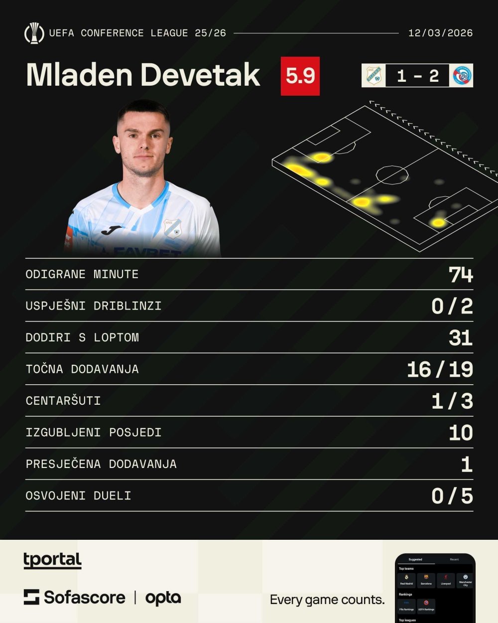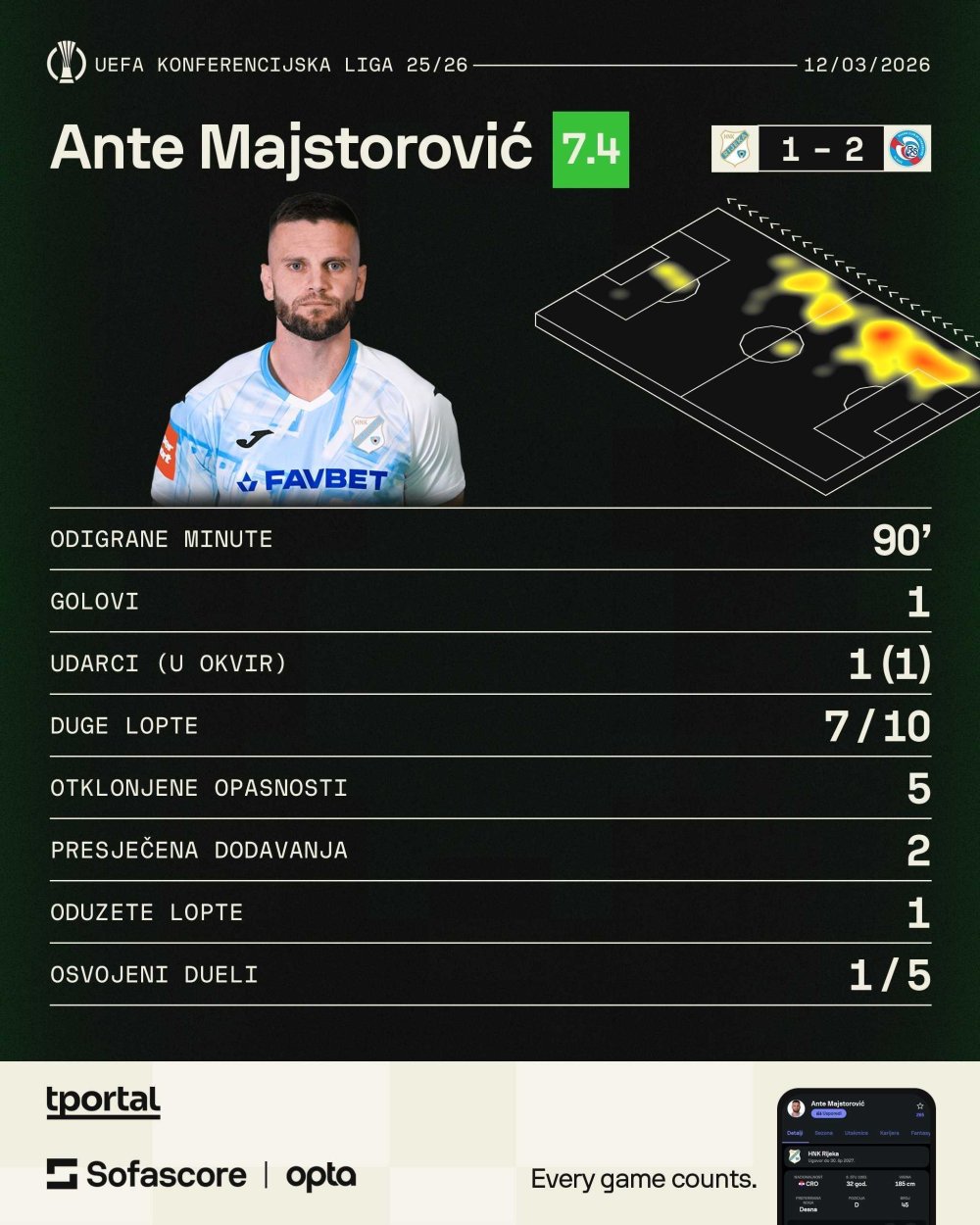 Donijelo je to i nekih dobrih stvari. Toni Fruk je imao nekoliko dobrih poteza i udaraca, Amer Gojak je dva puta oduzeo loptu visoko na njihovoj strani terena u presingu po izgubljenoj loptu, no i dalje je to bila igra koja odgovara gostima. Zadnja linija Rijeke, koliko god da je i kvalitetna, jednostavno nema fizički kapacitet boriti se s igračima Strasbourga.