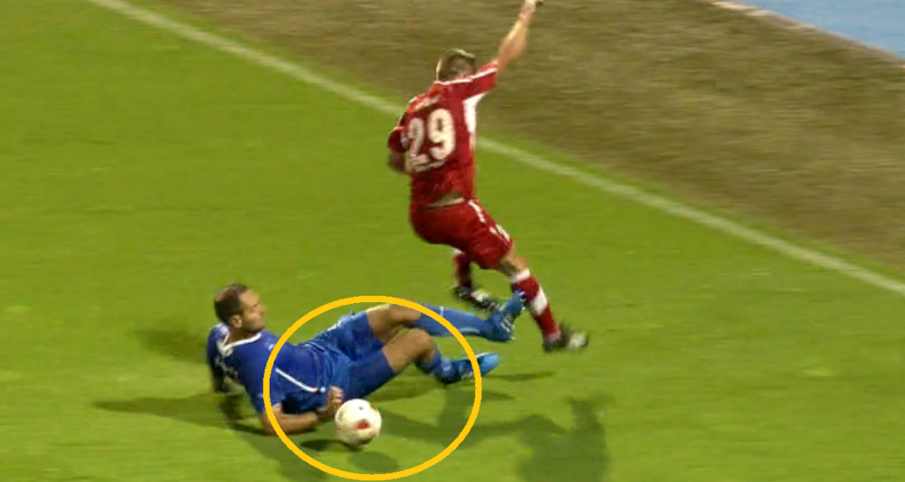 Ibriks se sjurio u kazneni prostor hrvatskog prvaka, Šimunić mu je uklizavanjem odnio loptu, ali je snimka pokazala i da ju je slučajno udario rukom.