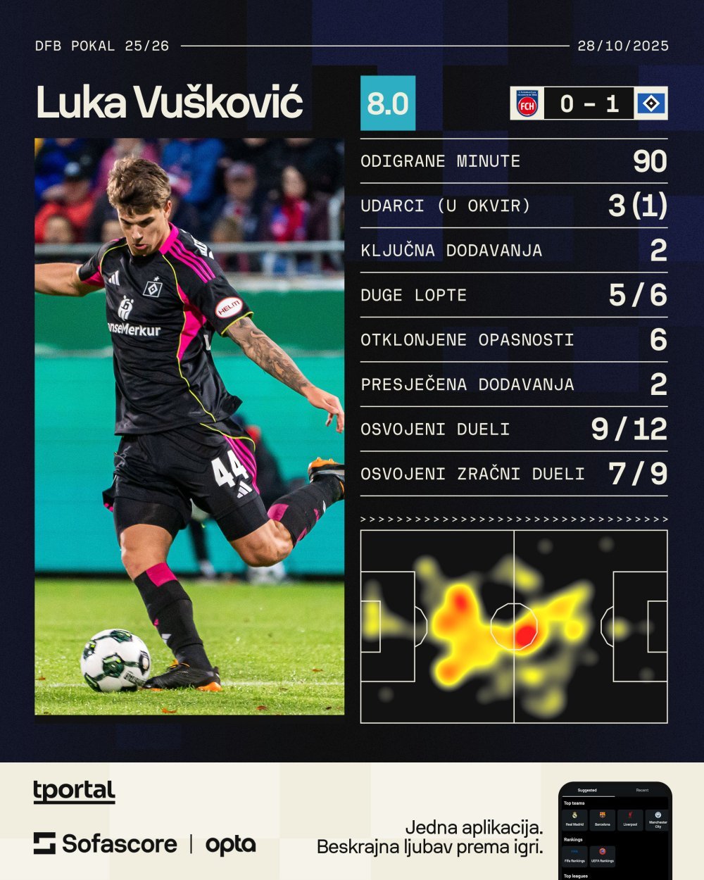 Sjajni hrvatski stoper dobio je ocjenu Sofascorea 8.0 i odnio titulu igrača utakmice. Vušković je imao 62 od 67 točnih dodavanja, čak pet od šest točnih dugih lopti te dva ključna dodavanja.