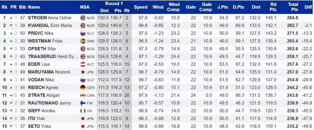 Treća je završila Slovenka Nika Prevc s 13.3 bodova manje. Prevc, prva favoritkinja za zlatne medalje, podbacila je u prvoj seriji, a u drugoj je uspjela napredovati za dvije pozicije. Na ovim Igrama je osvojila srebro na maloj skakaonici i zlato u ekipnom natjecanju, a predviđale su joj se tri zlatne medalje.
