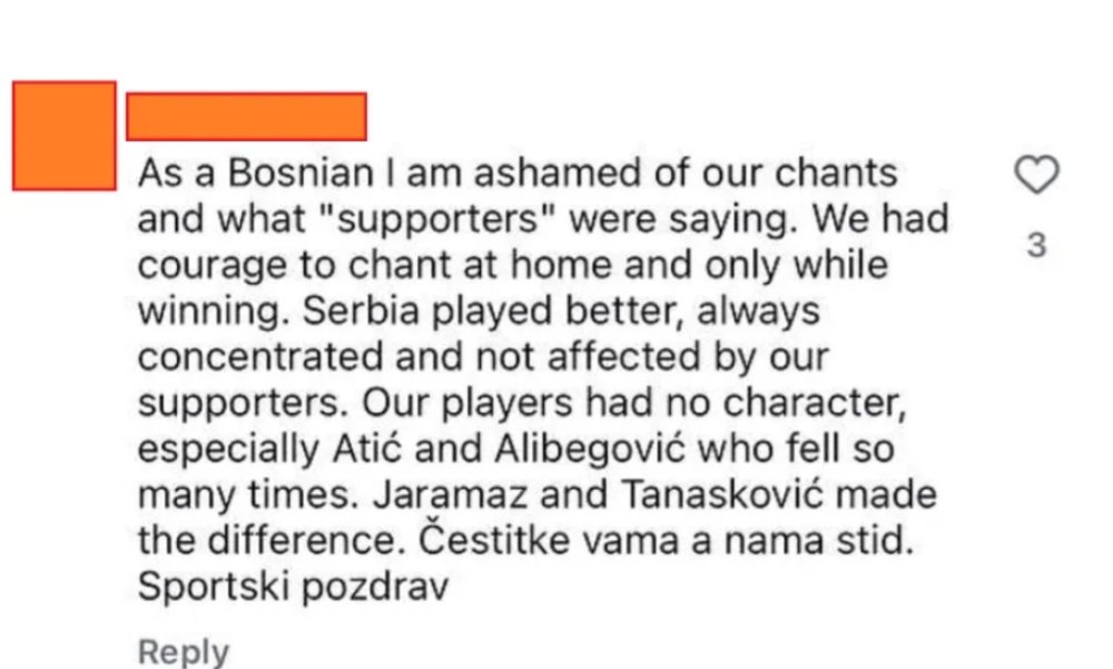 ‘Kao Bosanac, sramim se zbog naših povika i onoga što su “navijači” govorili. Imali smo hrabrosti pjevati kod kuće samo dok smo vodili. Srbija je igrala bolje, bila je koncentrirana i nije je doticalo ono što su naši navijači govorili. Naši igrači nisu pokazali karakter, posebno Edin Atić i Amar Alibegović, koji su previše padali. Jaramaz i Tanasković napravili su razliku. Čestitke vama, a nama stid. Sportski pozdrav’, napisao je navijač BiH.