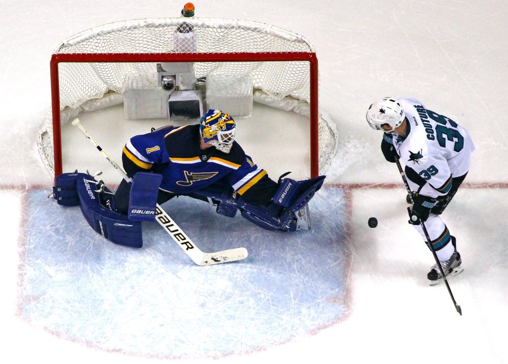 Blues, koji igraju u konferencijskom finalu prvi put nakon 2001., poveli su u 15. minuti prve trećine pogotkom Davida Backesa.Samo 34 sekunde kasnije Sharks su izjednačili kada je Thomas Hertl svladao Elliota.