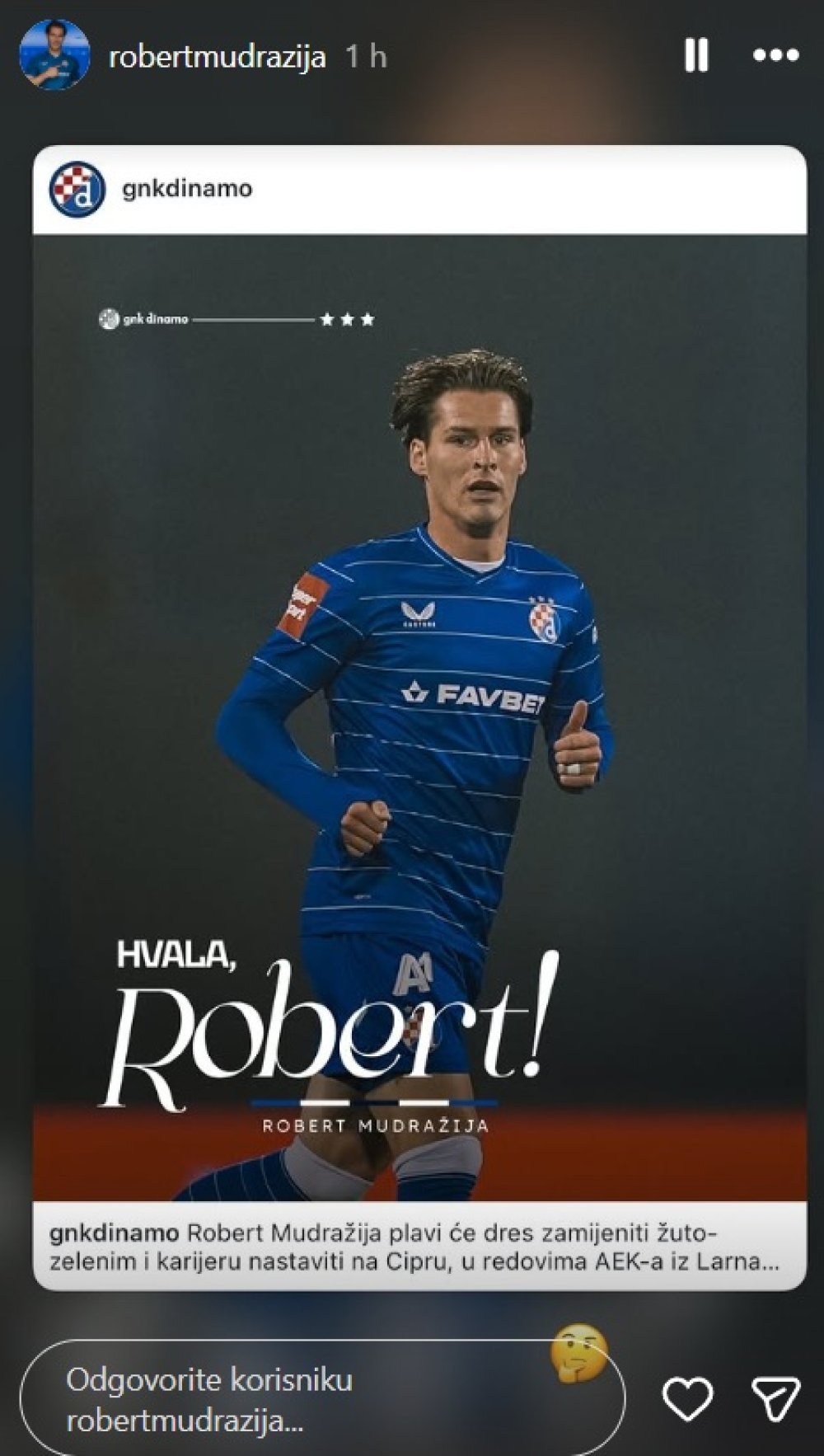 Veznjak Robert Mudražija napustio je Dinamo Zagreb i karijeru nastavlja u AEK-u iz Larnace na Cipru, a vijest je uzburkala navijače i hrvatsku nogometnu javnost. Nakon što je klub službeno objavio dogovor, Mudražija je na društvenim mrežama reagirao znakovitom porukom.