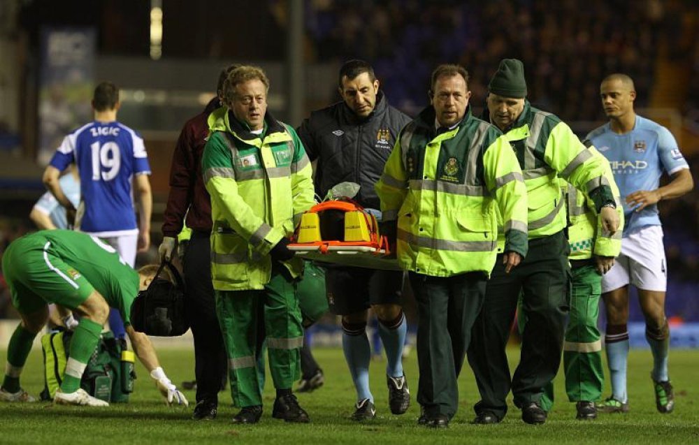 Micah Richards želio je u 35. minuti izbiti loptu. Bio je u naletu i pao je preko Birminghova nogometaša te nekontrolirano udario u suigrača Nigela de Jonga. Sudar je izgledao vrlo opasno.