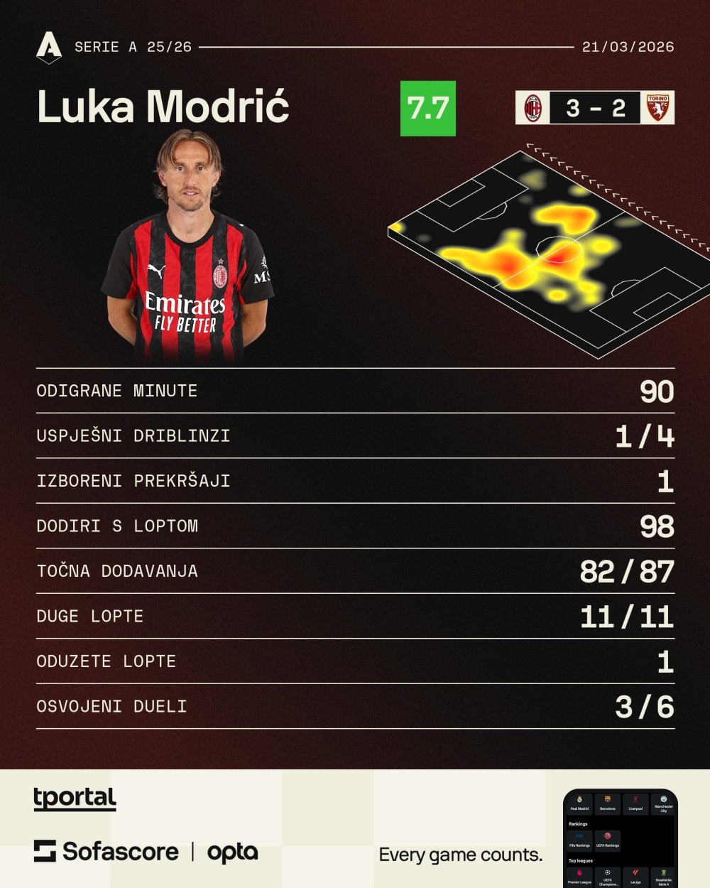 Hrvatski veznjak ponovno je bio jedan od ključnih igrača u veznoj liniji Milana - miran na lopti, precizan u pasu i iznimno važan u kontroli ritma utakmice. Upravo je iz njegove akcije krenuo i napad za gol koji je prelomio susret.
