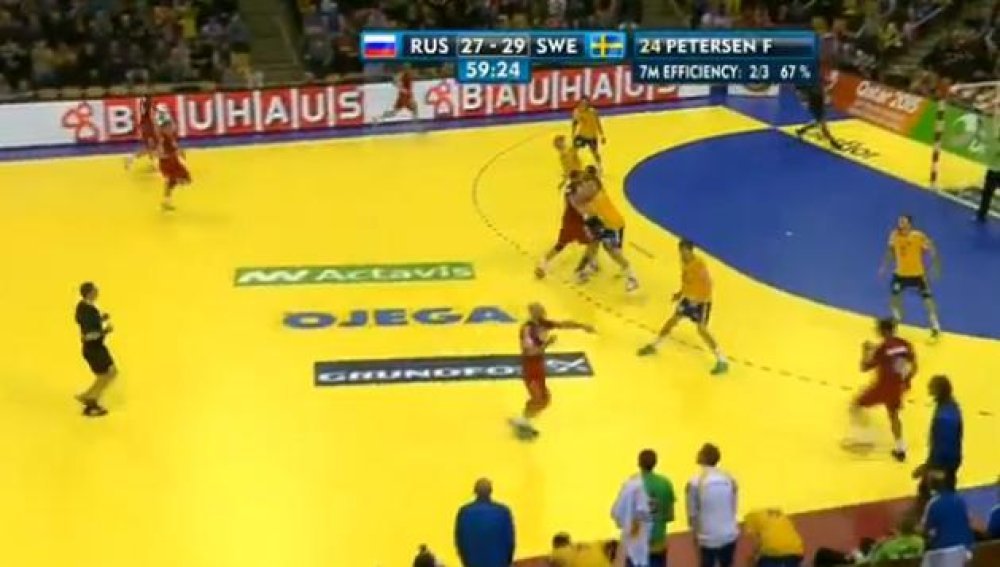 Ipak, u drugom poluvremenu dogodio se veliki preokret. Švedska je potpuno posustala, desetak minuta nije bila u stanju postići pogodak i Rusi su velikom serijom stigli do vodstva 26:25 pet minuta prije kraja. Međutim, uslijedio je novi preokret. U samoj završnici Švedska je bila mirnija i stigla do pobjede 29.27, zahvaljujući golovima Karlssona i Petersena u zadnjih par minuta.